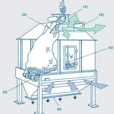 Cold air fully enters from the bottom, using a large intake area and high cold air utilization. This results in superior cooling, low energy use, and easy operation, making the counterflow pellet cooler an upgrade over vertical and horizontal coolers.