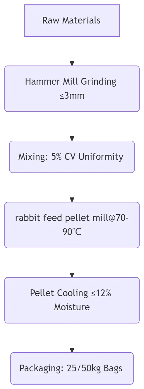 A specialized feed processing system combining grinding (≤3mm particle size), mixing (CV≤7%), and pelleting (70-100℃ thermal treatment) to produce nutritionally balanced bunny food with 12-18% moisture content.